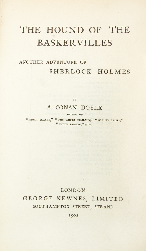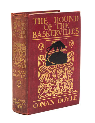 The Hound of the Baskervilles. London: George Newnes, 1902.8vo, original red cloth stamped in black and gilt. First edition, first issue, with "you" for "your" on p. 13. Illustrations by Sidney Paget. Light soiling to boards; ends bumped; glassine torn; hinges starting.