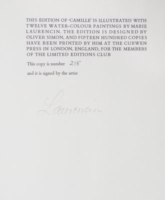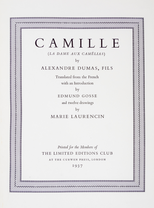Camille [La Dame aux Camelias]. Illustrated by Marie Laurencin. London: The Limited Editions Club, 1937.4to, publisher's cream cloth with gilt-floral design to upper cover, t.e.g. Limited edition, number 215 of 1,000 copies signed by the artist.