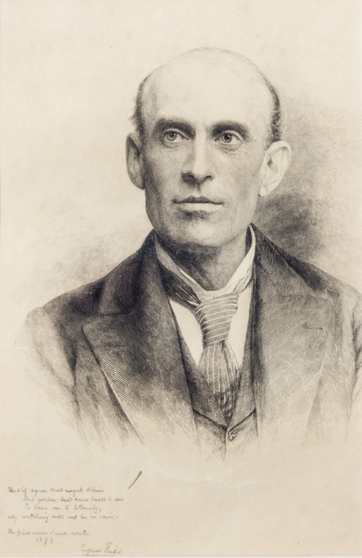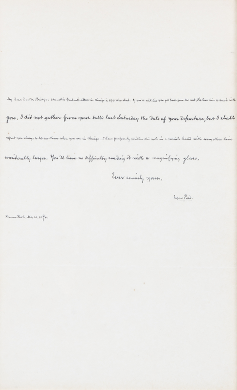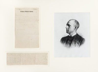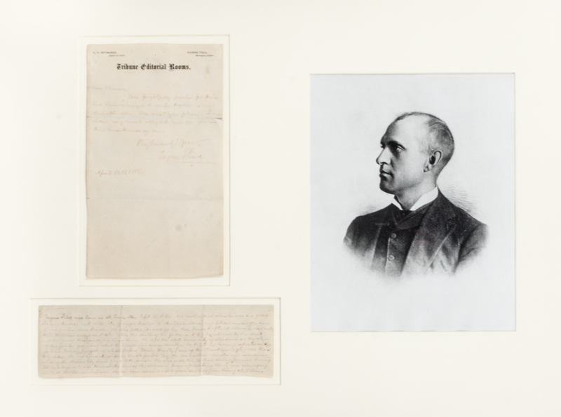 Two autographed letters and an incribed print.1) Autographed letter signed ("Eugene Field"), one page, Buena Park, May 20, 1894. To Norman Bridge, to whom Field provides Hamlin Garland's address in Chicago; 2) Autographed letter signed ("Eugene Field"), one page, on Tribunal Editorial Rooms letterhead, April 10, 1882. To Clemens Framed and matted.