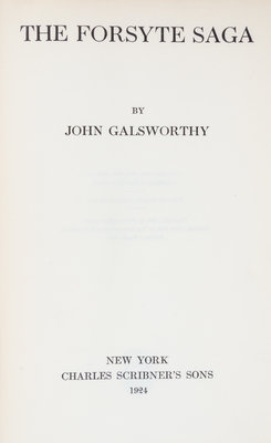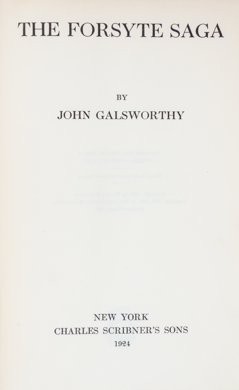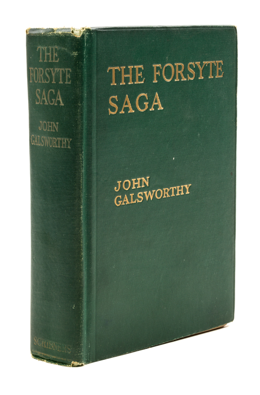 The Forsyte Saga. New York: Charles Scribner's Sons, 1924.8vo, publisher's original green cloth, gilt-lettered title, signed by the author on the f.f.e.p. Hinges starting; pages toned; boards cocked; corners bumped.