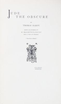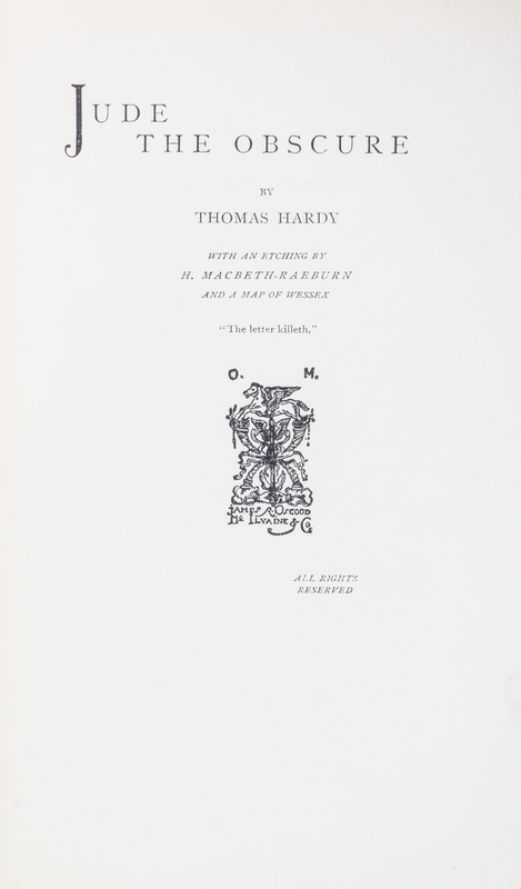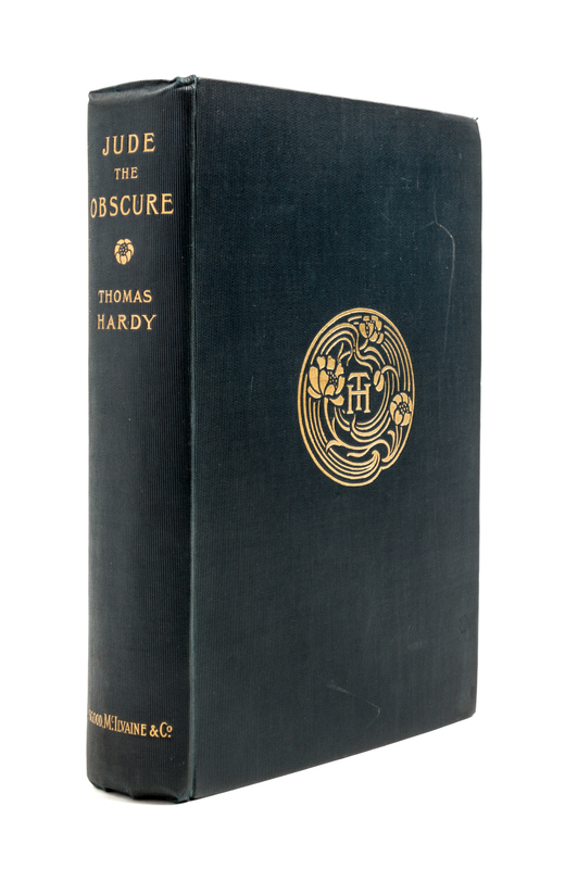 Jude the Obscure. London: Osgood, McIlvaine and Company, 1896.8vo, publisher's green cloth. First edition in book form, with etched frontispiece and map of Essex. Spine ends and corners bumped.