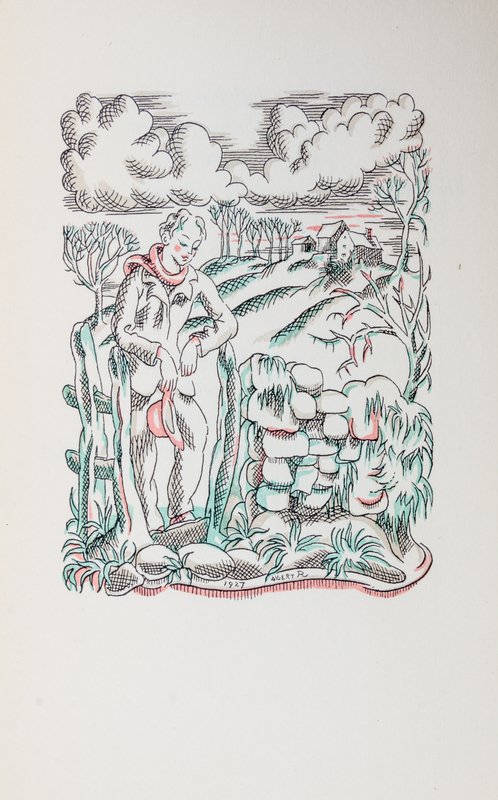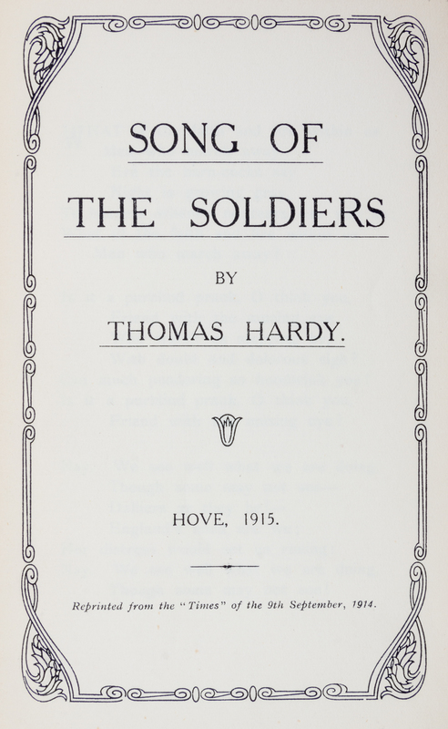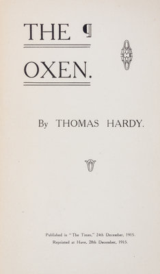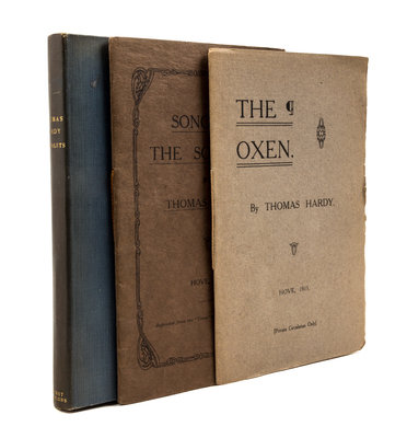 A group of three pamphlets.A Yuletide in a Younger World. London: Faber & Gwyer Limited,(1927). Small 8vo, 2pp. on bifolium, with printed green wrappers., with custom blue cloth covered chemise and slipcase. Slight toning to edges; The Oxen. s.l.: Hove, 1915. 8vo, 1 pp. on bifolium, original brown printed wraps. Minor toning and small chips to wrappers; Song of the Soldiers. s.l.: Hove, 1915. 2 pp. on bifolium original dark brown printed wraps. Minor toning; corners slightly bumped.