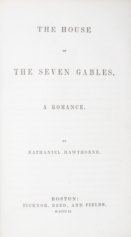 The House of Seven Gables. Boston: Ticknor, Reed and Fields, 1851. 8vo, publisher's brown cloth stamped in blind. First edition, first issue, with ads dated March 1851. Spine ends and corners bumped with some loss; boards cocked.