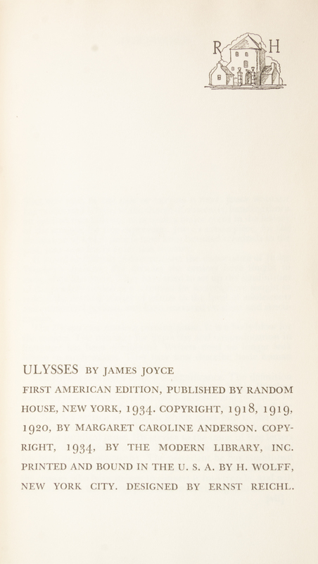 Ulysses. New York: Random House, 1934.8vo, publisher's tan cloth lettered in red and black, original dust jacket. First U.S. edition. Dust jacket lightly soiled with repaired tear across and along spine; light soiling to boards; pencil notations to f.f.e.p.