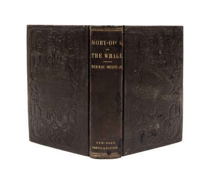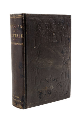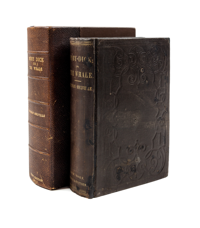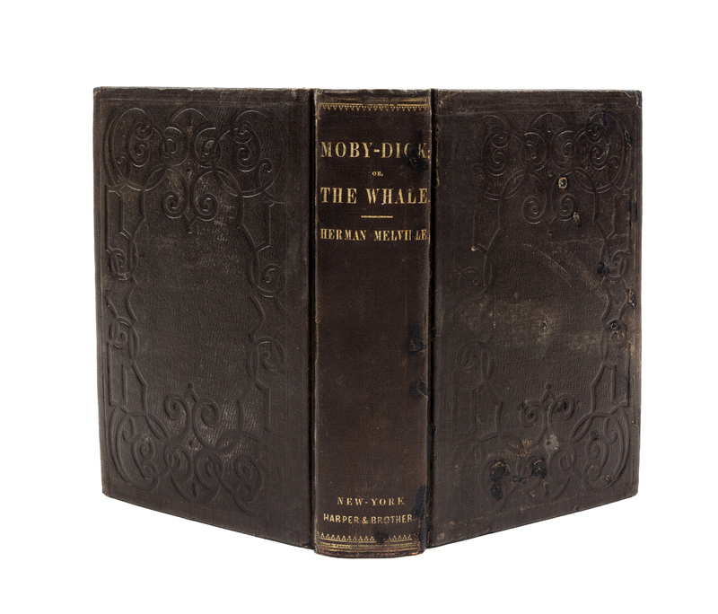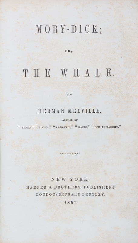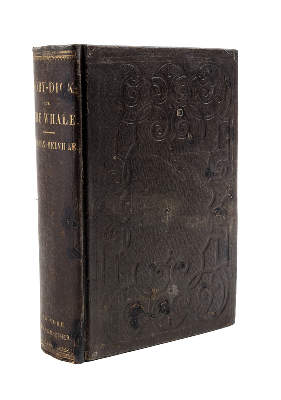 Moby-Dick or The Whale. New York: Harper and Brothers Publishers, 1851.8vo, publisher's drab brown cloth with an arabesque design in blind, gilt-lettered spine, yellow endpapers. Thomas Melville copy, with stamped ex-libris to f.f.e.p. and transferred to front pastedown. First American edition, following the English edition by a month and containing some thirty-five passages not present in the English edition (deemed "profane"). Many unsold copies of the first edition were destroyed. With 6 pp. pbs' ads. Wear to boards, expertly repaired at spine, edges, corners and a few points and upper and lower board; evenly toned at preliminaries with intermittent light brown staining throughout.