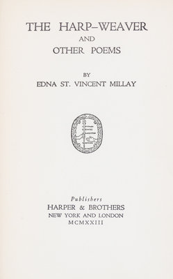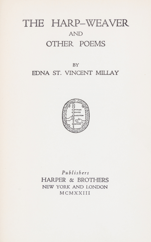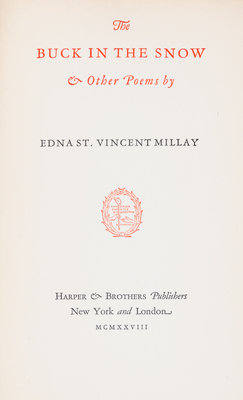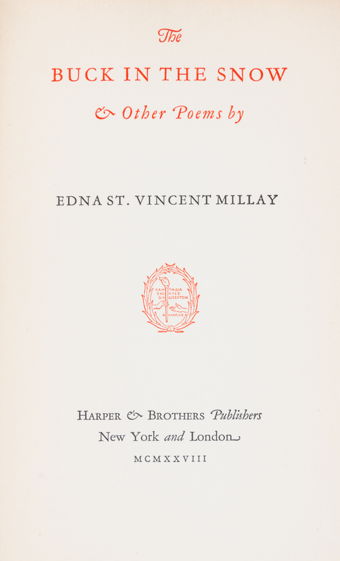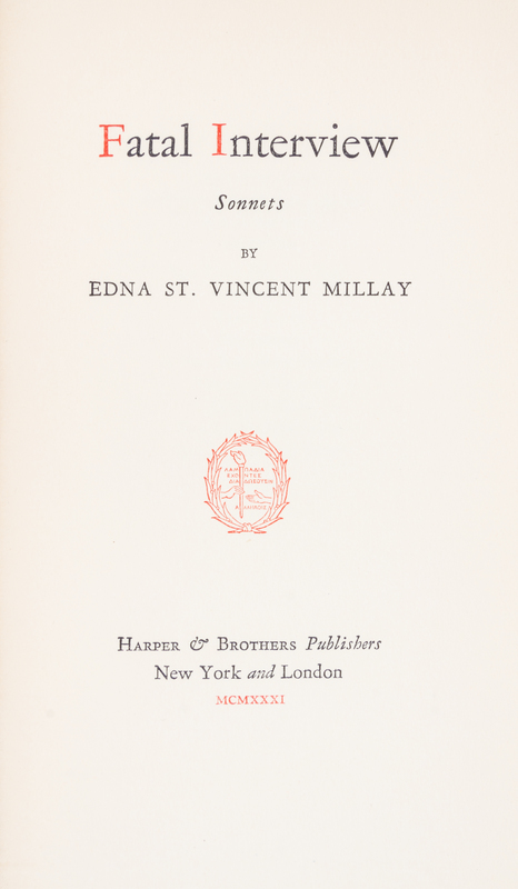 Six first editions comprising The harp Weaver and Other Poems. New York, 1923; The Buck in the Snow and Other Poems. New York, 1928; Fatal Interview. New York, 1931; Wine from These grapes. New York, 1934. With dust jacket; Conversation at Midnight. New York, 1937. With dust jacket; Huntsman What Quarry? New York, 1939. With dust jacket.6 vols., 8vo, dust jackets are toned at spines; corners bumped.