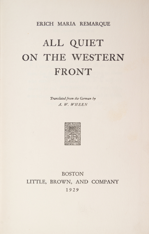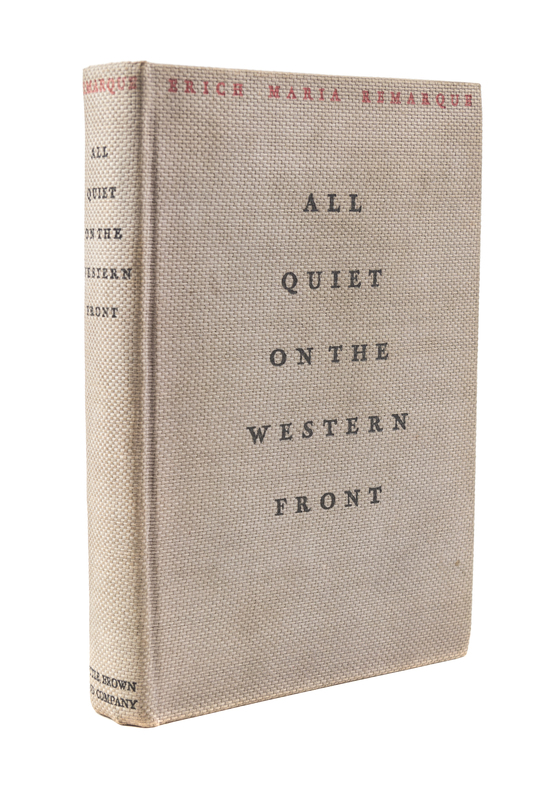 All Quiet on the Western Front. Boston: Little, Brown, 1929.8vo, publisher's grey buckram lettered in red and black. First American edition, stated first printing. Soiling to boards; hinges starting; lacking dust jacket.