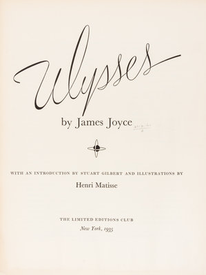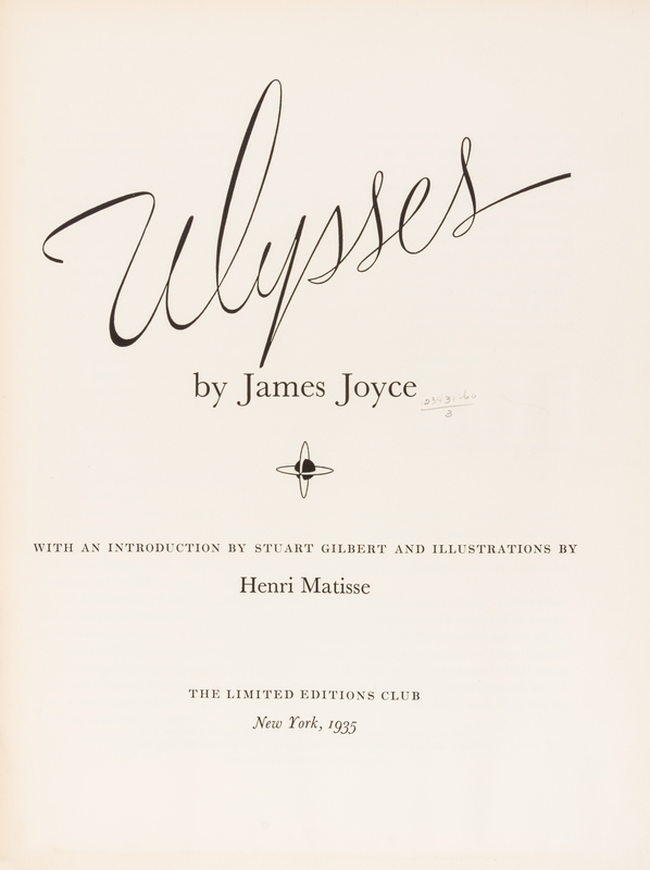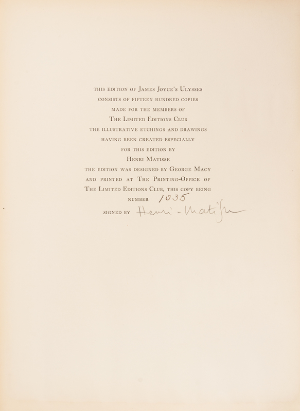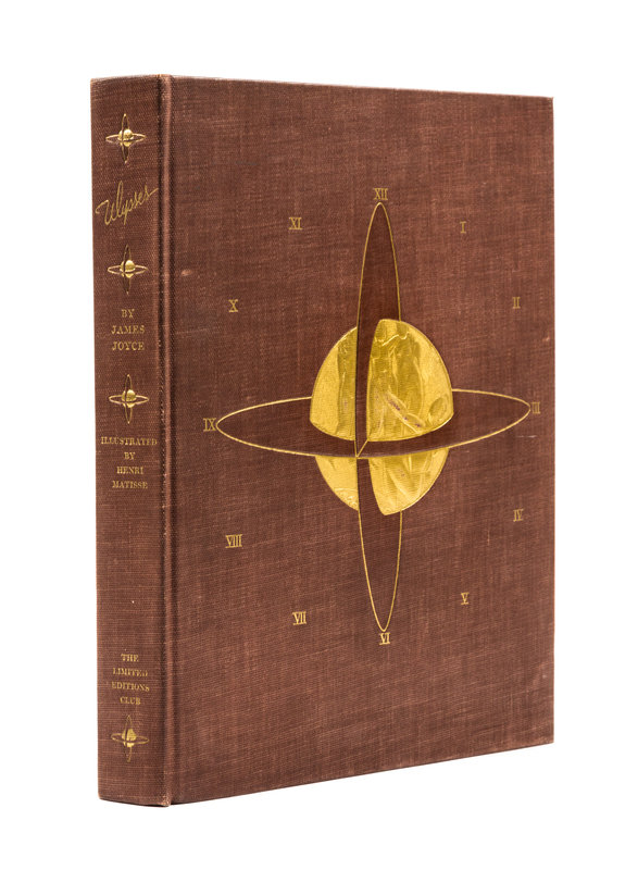 Ulysses. New York: Limited Editions Club, 1935.4to, publisher's brown buckram gilt-stamped with bas-relief design by LeRoy Appleton to front board. Housed in publisher's light orange slipcase. Number 1035 of 1,500 copies printed for Limited Editions Club members and signed by Matisse on the limitation page. With 20 lithographed and etched plates after drawings by Matisse. Light soiling to slipcase; minor edgewear to boards; front hinges starting; rubbing to gilt on relief; otherwise fine.