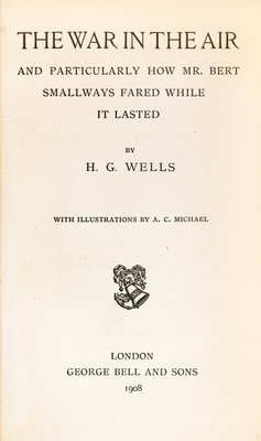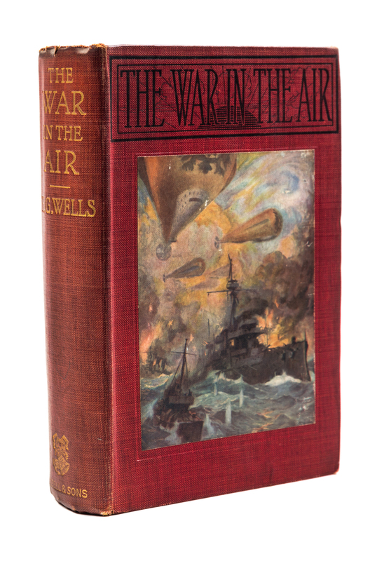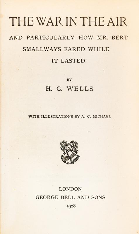 The War in the Air, and Particularly How Mr. Bert Smallways Fared While it Lasted. London: George Bell and Sons, 1908.8vo, original cloth with pictorial onlay to upper board, gilt-lettered spine. First edition. Illustrated with 16 plates. Light soiling to cloth; ends bumped; bookplate tipped to front pastedown; toning to edges of leaves.