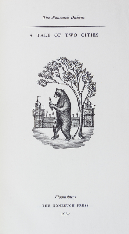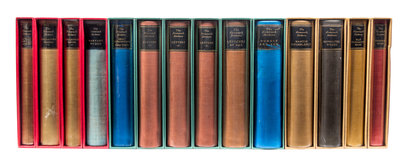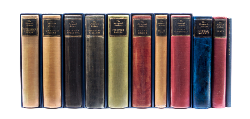 The Nonesuch Dickens. Bloomsbury: Nonesuch Press, 1937-1938. Complete in 25 vols. 4to (10 1/4 x 7 inches), original cloth bindings, most with aftermarket slipcases, with four volumes intensified through recoloring, t.e.g. Limited to 877 copies. Includes "Nonesuch Dickensiana" and the special volume titled "Plate" in which is housed an original woodblock used to make the illustrations, this one being from "The Old Curiosity Shop" and includes a matted impression of that plate. Recolored volumes in blue with spots of paint at page edges and endpapers.