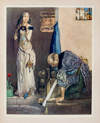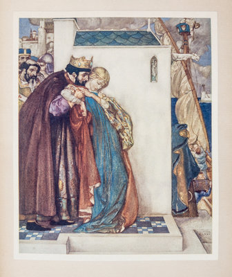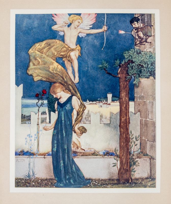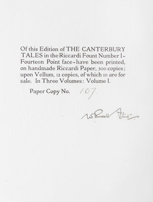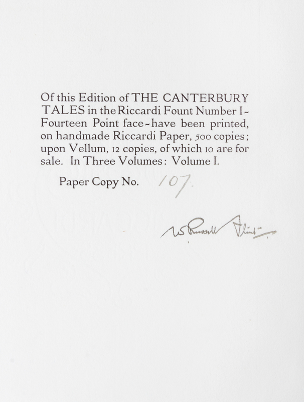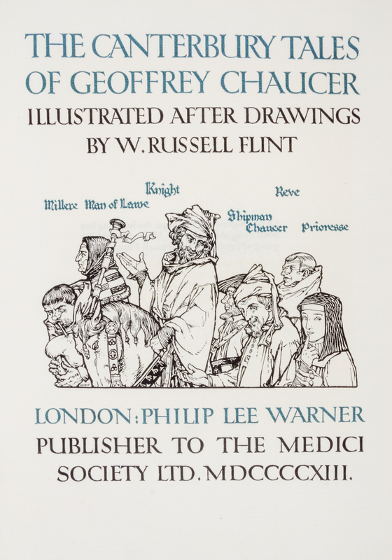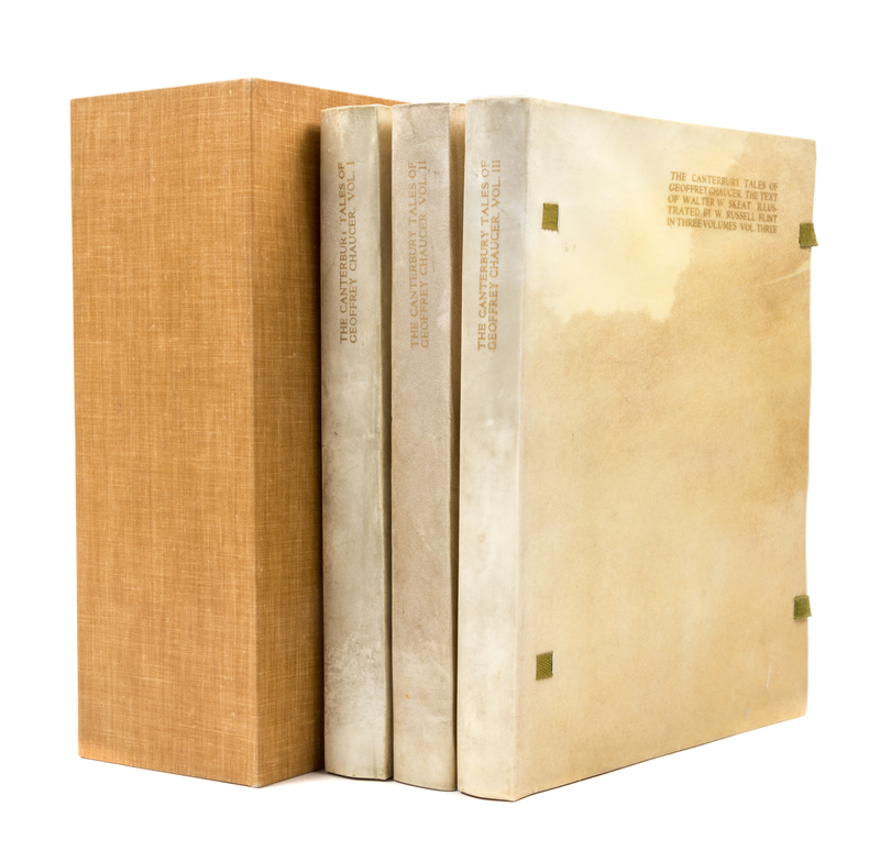 The Canterbury Tales. London: Philip Lee Warner, Publisher to the Medici Society, 1913.3 vols. 4to, publisher's vellum gilt, slipcase, green cloth ties. Limited edition, number 107 of 500 copies on handmade Riccardi paper. Illustrated with pictorial titles in blue and black and numerous mounted color plates by William Russell Flint with captioned tissue guards. Vellum toned.