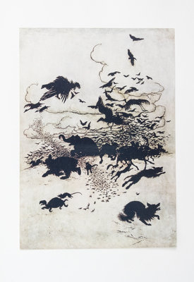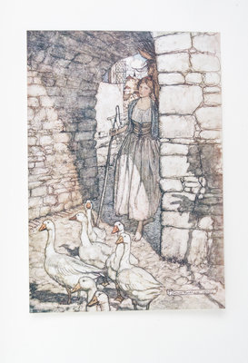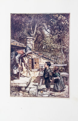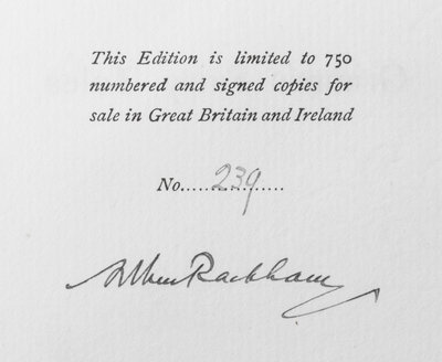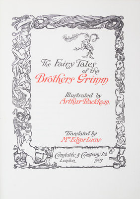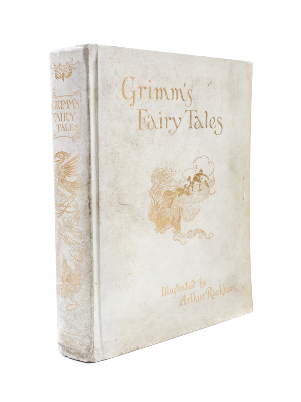 The Fairy Tales of the Brothers Grimm. London: Constable, 1909.Folio, original vellum gilt. Limited edition, number 239 of 750 copies signed by Rackham. Complete with 40 mounted color plates with lettered tissue guards, 10 full-page illustrations in black and white and numerous others in text, title within pictorial border. Boards soiled and lightly bowed; lacking silk tie; hinges tender.