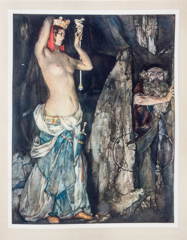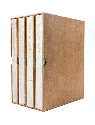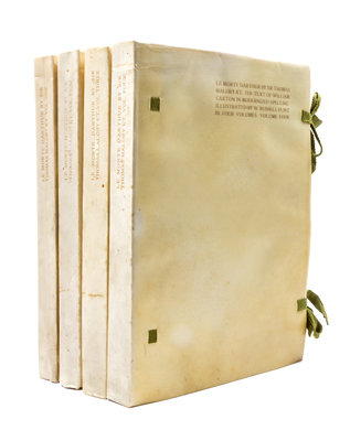 Le Morte D'Arthur London: Philip Lee Warner Publisher to the Medici Society, 1910-1911. 4 vols. 4to, publisher's vellum gilt, each vol. individually slipcased, green cloth ties. Limited edition, number 162 of 500 copies on handmade Riccardi paper. Illustrated with pictorial titles in blue and black and numerous mounted color plates by William Russell Flint with captioned tissue guards. Bookplates tipped in front pastedowns: Arthur H. Reynolds; vellum toned.