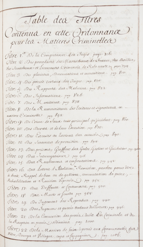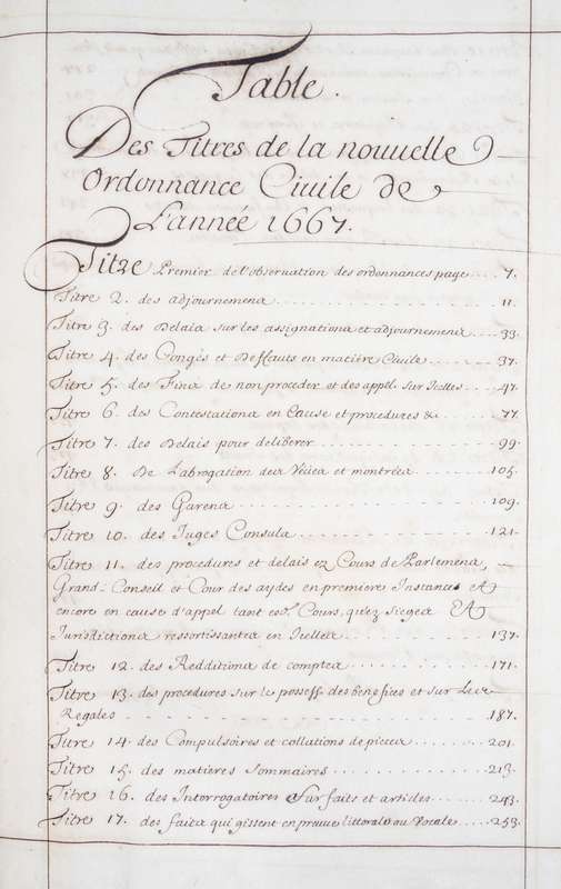 [Proces verbal de l'ordonnances civil et criminal de 1667.] [s.l.], n.d. (circa 1680)1052pp. manuscript pages on watermarked paper. Folio, full calf. Comprising what appears to be a full manuscript of a final work on legal reform authored by Jean Baptise Colbert. It is separated into two parts, Civil and Criminal. The first page is a table that describes the work as containing "Des Titres de la nouvelle Ordonnance Civile de L'annee 1667" or the titles of the new civil laws for the year 1667 (1-709pp.) followed by "de Titres Conenua en cette Ordonnance pour le Matieres Criminelle" or criminal law (710-1052pp). Similar hand-writing samples provide no firm conclusion; likely in the hand of Colbert or possibly his scribe, Nicolas Joseph Foucault. Provenance: stamped "Bibliotheque Henri Rameau" on the front endpaper.