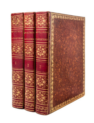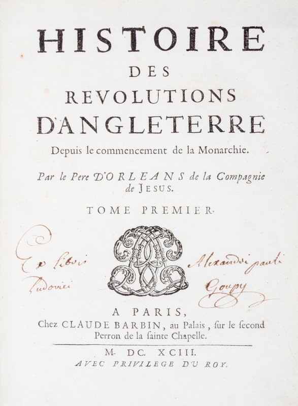 Histoire des Revolutions d'Angleterre. Depuis le commencement de la Monarchie. Paris: Chez Claude Barbin, 1693-1694.3 vols. 4to (9 3/4 x 7 1/4 inches), early 19th century marbled calf with red morocco spine in the style of Bozerian, marbled endpapers, a.e.g. First edition, complete with eight engraved portraits. Baron de Mackau copy, with his bookplate. Previous owner's name on the title page in an early hand "Ex libris Alexandripauli Ludovici Goupy." Minor wear to the bindings; occasional minor staining to the text; pp. 497-500 in first volume with tear neatly repaired.
