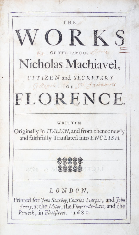 The Works of the Famous Nicholas Machiavel, Citizen and Secretary of Florence. [Translated by Henry Neville]. London: Printed for John Starkey, Charles Harpe, and John Amery, 1680.Folio, full mottled calf, rebacked, retaining original spine. Second collected edition in English, with several works individually titled. Light soiling to a few leaves, largely at the beginning and end; rubbing to boards; one page with a small tear in the margin, and many leaves with a minor crease to the top corner. Ex Libris: Collegio Sti. Salvatoris, to title page.