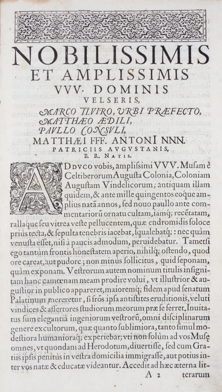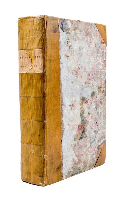 [Epigrammaticon libros omnes.] (Ingolstadii: Adam Sartorius, 1611).Folio, marbled boards rebacked and recornered with cloth, manuscript title to spine and f.f.e.p. illustrated with woodcut initials, and head- and tail-pieces. Lacks A1 (title page); dampstain near the bottom edge throughout most of the text; text block separating at several points; boards worn; a few small page tears; final leaf of index is soiled with loss to the corner; some wormholing.