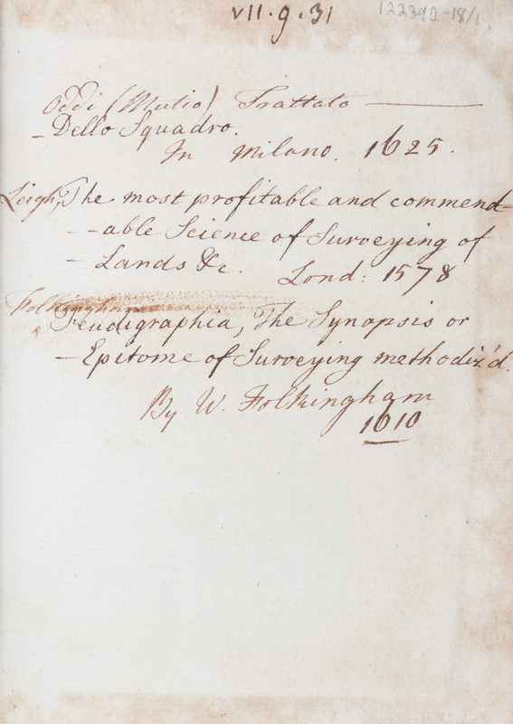 Three 16th and 17th century works on surveying bound as one. 8vo (6 7/8 x 5 1/4 inches), full contemporary calf, gilt-lettered red leather spine label. Earls of Macclesfield copy, with bookplate, shelfmark and blindstamp. Comprising: The Moste Profitable and commendable Science of Surveiying of Landes, Tenements and Hereditaments. By Valentine Leigh. London: for Andrewe Maunsel, 1578. With three fold-out tables; Dello Squadro Trattato Dimutio Oddi da Urbino. By Muzio Oddi. Milan: Bartolomeo Fobella, 1625. With engraved title page and diagrams throughout; Feudigraphia. The Synopsis or Epitome of Surveying Methodized.....And no less remarkable for all Under-takers in the Plantation of Ireland or Virginia... By William Folkingham. London: printed for Richard Moore, 1610. Sabin 24951