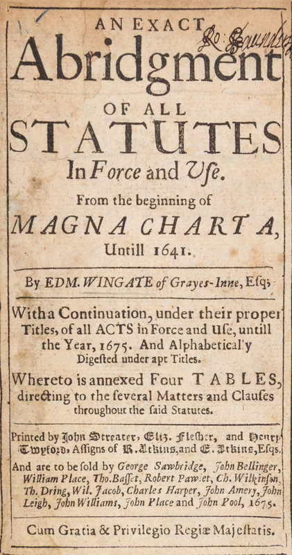 An Exact Abridgment of All Statutes in Force and Use. From the Beginning Magna Charta, Untill 1641. London: John Streater et al., 1675. 8vo, rebound in 3/4 tan morocco. Later edition. Brownspotting throughout; boards soiled.