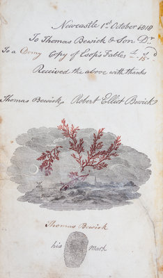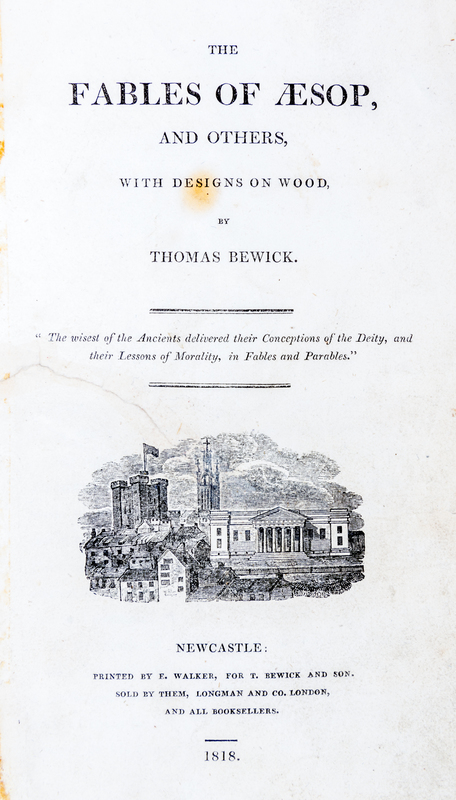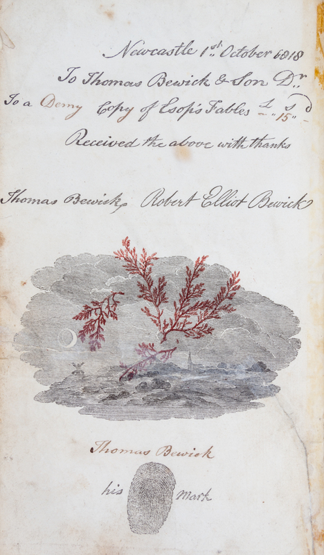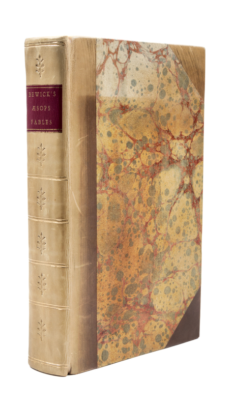 The Stories of Aesop and Others with Designs on Wood. Newcastle: E. Walker, 1818.8vo, 3/4 modern calf over marbled boards, woodcut title vignette, head- and tail-pieces by Bewick throughout. First edition, 'thumb-mark' receipt page with woodcut vignette over-printed with copper-engraved red seaweed spray, signed by Bewick, with "Demy" in his hand, the remaining in another hand. Spine and top edge is sunned; first and final few leaves of text are soiled and worn, with a few tears and creases to the edges; title page has old adhesive residue along the gutter, and has a repaired tear; Minor foxing, and a few small stains here and there.