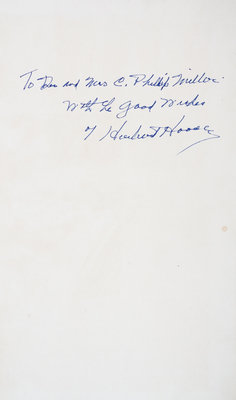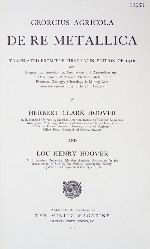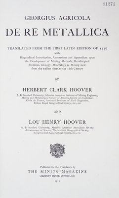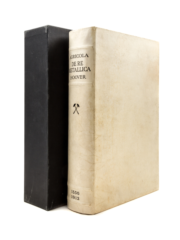 De Re Metallica. Translated by Hebert Clark Hoover and Lou Henry Hoover. London: The Mining Magazine, 1912.Folio, original full vellum, cloth slipcase. Inscribed on the f.f.e.p. to Dr. and Mrs. Phillip Miller from Herbert Hoover. Endpapers toned; otherwise fine.