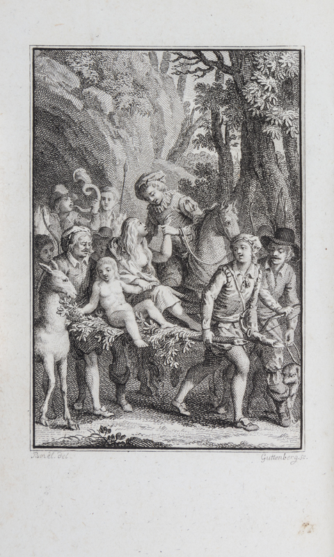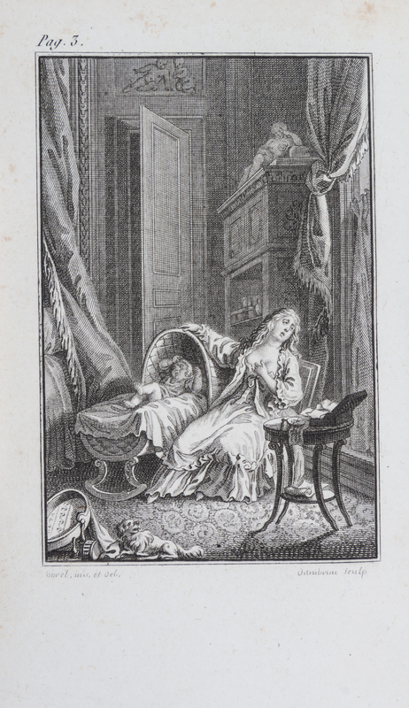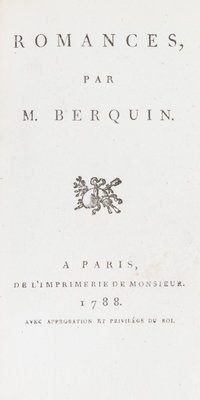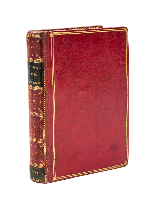 Romances, par M. Berquin. Paris: Published by the author 1788.12mo (5 1/4 x 3 3/8), finely bound in full red morocco with green leather spine labels, a.e.g. Early edition (not first edition). With 10 fine plates of Borel (lacking 18 leaves of music). Previous owner's attractive engraved armorial bookplate neatly affixed to the front pastedown endpaper: Sir David Lionel Goldsmid Stern Salomons.