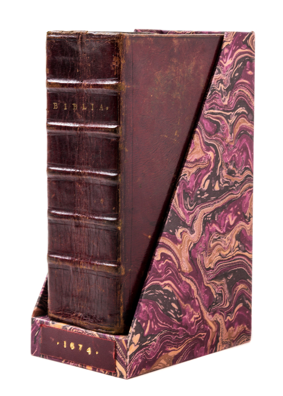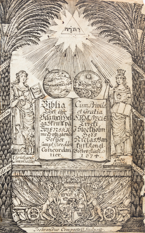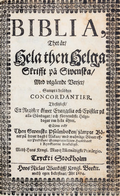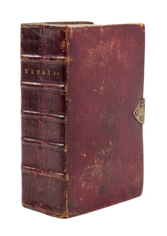 Biblia. Thet ar, Hela then helga skrifft po swenska, med vtgaende verser, sampt i bradden concordantier. Stockholm: Niclas Wankijff, 1674.12mo, full maroon leather binding with brass metal clasp and custom fleece-lined shelf case. a.e.g. First edition. Complete with an engraved title page by Isebrandus Compostell. [xciv], 1080 pages (Old Testament), followed by 300 pages (New Testament), [iv], 64 pages. Minor shelfwear to binding; minimal loosening of some page gatherings (signatures); first three leaves have small tears, a few tiny chips, and rubbing to the extremities. Several pages and slightly browned and/or slightly soiled.