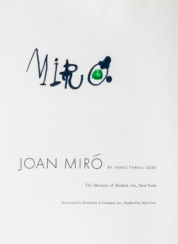 Joan Miro. New York: The Museum of Modern Art; Garden City: Doubleday, 1959.Square 8vo, publisher's pictorial cloth, dust jacket, unclipped. Signed on the title page by Miro in ink. First edition, profusely illustrated throughout. Jacket toned.