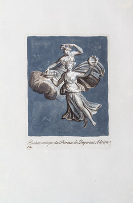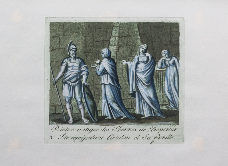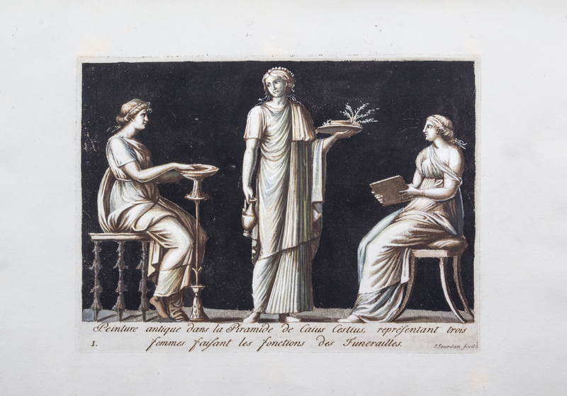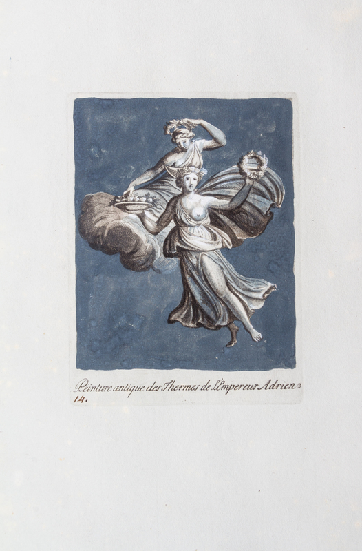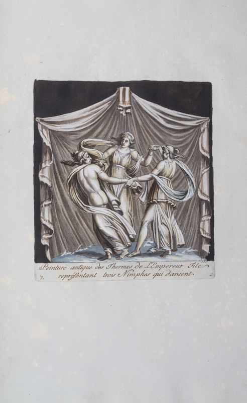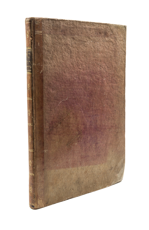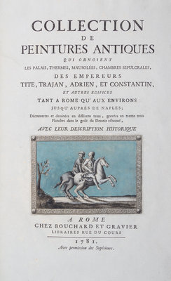 Collection de Peintures Antiques qui ornoient les palais, thermes, mausoles, chambres sepulcrales, des empereurs Title, Trajan, Adrien, et Constantin. Rome: Bouchard et Gravier, 1781.Folio, contemporary quarter calf over tan paper boards, spine gilt, gilt-lettered brown morocco spine label. Complete with title page and 33 hand-colored plates of mural from ancient Rome. A few pages with minor soiling, and the binding is lightly faded and worn.