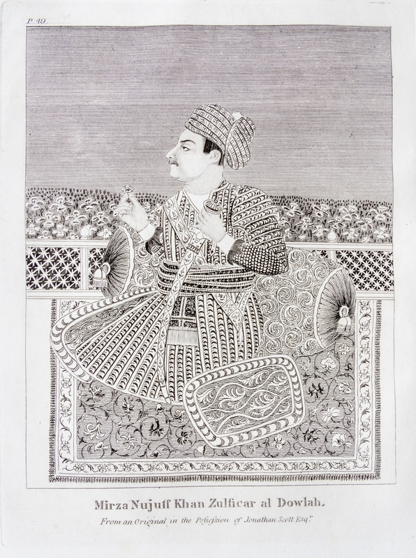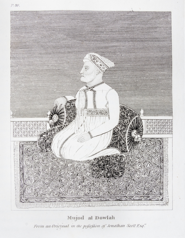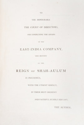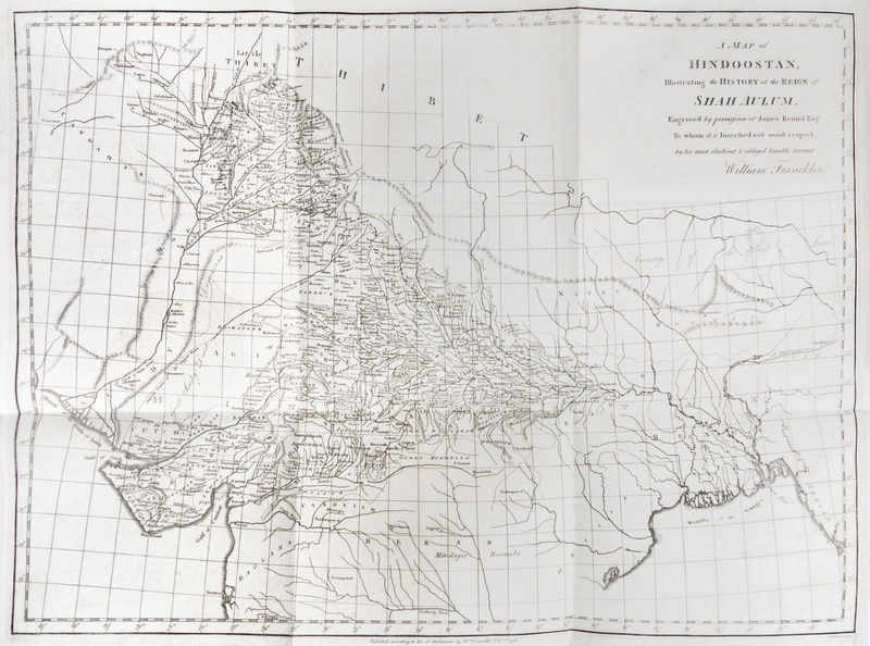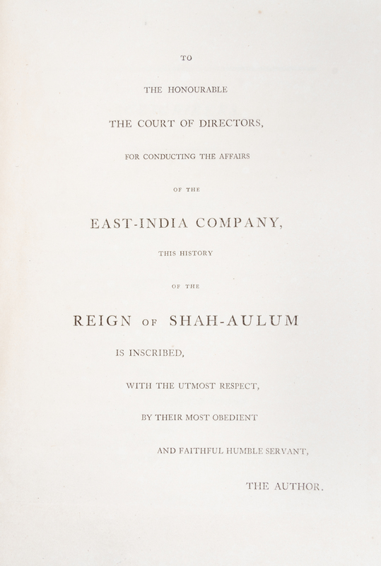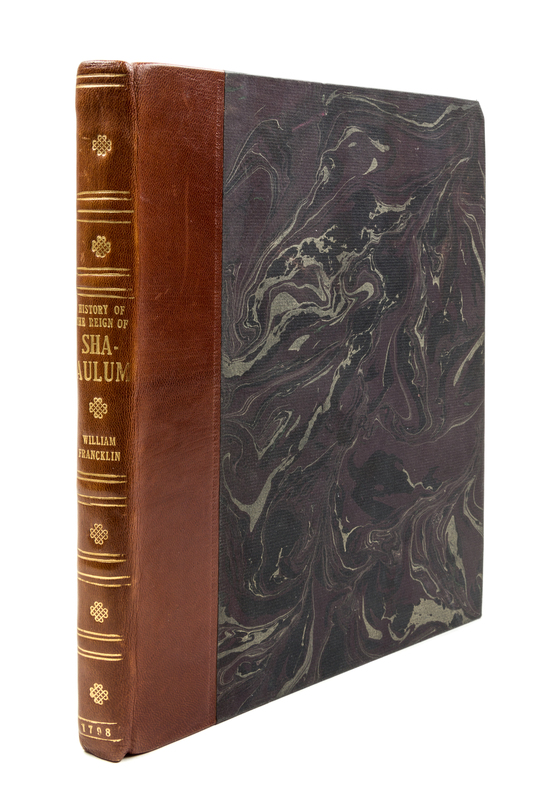 The History of the Reign of Shah-Aulum, the Present Emperor of Hindostaun. London: Cooper and Grahm, 1798.Folio, rebound in modern quarter tan morocco over marbled boards, marbled endpapers. First edition, with fold-out map and six engraved portraits. Dampstain to the top of some portraits; light intermittent foxing.