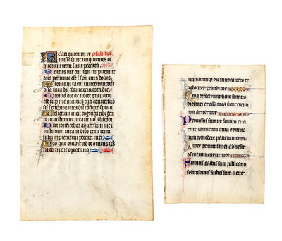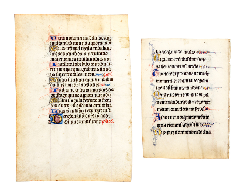 Two illuminated manuscript leaves, 15th century, on vellum.Including: [7 1/2 x 5 1/4] both sides with 17 lines of text, 14 illuminated initials (seven to each side; four heightened in gold; largest 1 1/2 inch tall) and further decorated with red, blue and black designs and tailings[5 1/2 x 4] both sides with 12 lines of text, nine illuminated initials (approx. 3 inches tall each, five heightened in gold) and further decorated with red and blue designs and tailings, some also heightened in gold.