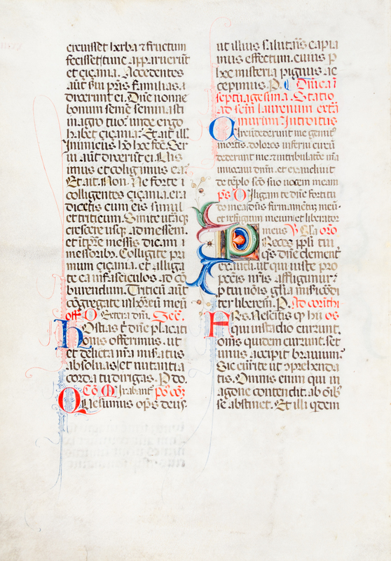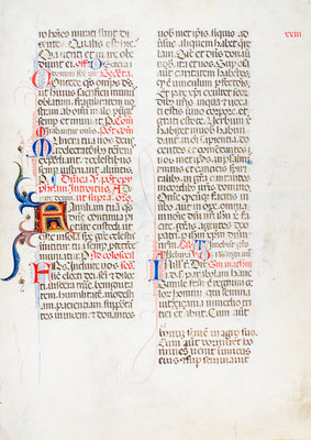 An illuminated manuscript leaf, 15th century, on vellum, text in two columns on both sides each 30 lines (one extending to 34), 18 illuminated initials (two largest at 1-inch, both heightened in five or more colors, both of which extend and inhabit several inches of the margin with floral inspired decorations) and blue and red tailings in other margins.