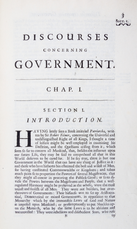 Discourses Concerning Government. London: Booksellers, 1798.Folio, full paneled calf backed with modern calf. Ex-library stamp and bookplate; wear to boards; title page starting to detach.