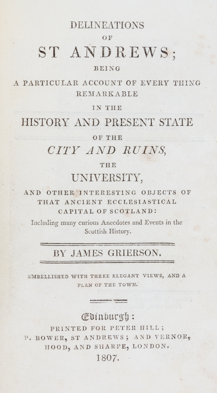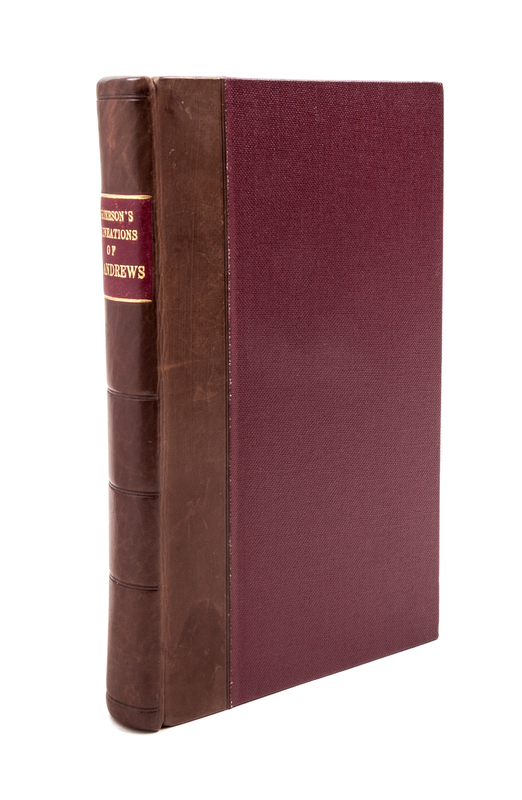Delineations of St. Andrews. Edinburgh: printed for Peter Hill; P. Bower, and Verner, Hood and Sharpe, 1807.8vo (7 3/8 x 4 1/2 inches), modern half calf over maroon boards, endpapers renewed. First edition, complete with four engraved plates (three views and a city plan). The index includes the entries "Golfers, company of", "Golf, history of", "Golf, nature of", "Golf balls, how made" and "Golf balls, number made at St. Andrews." First few leaves strengthened with Japanese tissue; some light soiling to text, with a few tiny tears at several page edges; otherwise very good.