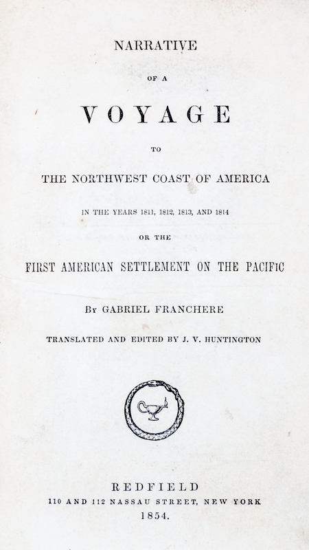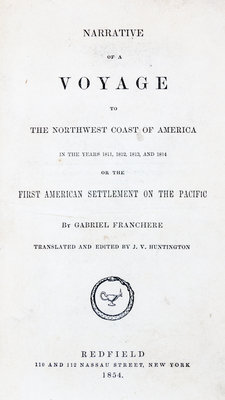 Narrative of a Voyage to the Northwest Coast of America in the Years 1811, 1812, 1813, and 1814 or the First American Settlement on the Pacific. New York: Redfield, 1854.Small 8vo, rebound in cloth. Second edition, being the first edition published in English, with an added chapter. Illustrated with three plates. Minor foxing scattered throughout the text, and minor soiling to the first few leaves.