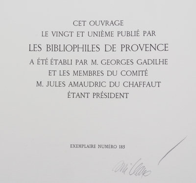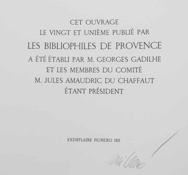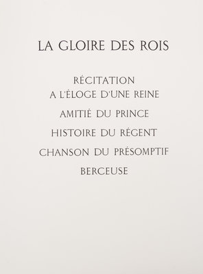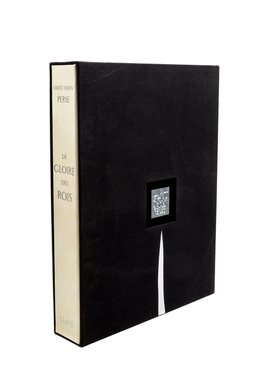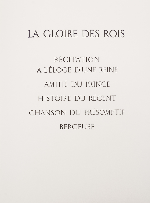 Le gloire des rois. Marseille: [Bibliophiles de Provence], 1976.Folio, contents loose as issued in original thick wrapper folder, chemise, plexiglas covers and black close slipcase with embossed metal plaque. Complete with 12 full-page color spread and three original collages. Limited to 240 copies, of which this is number 185 signed by the artist on Arches.