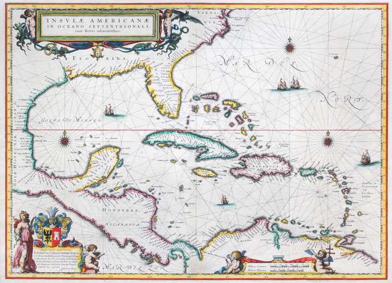 Insulae Americanae in Oceano Septentrionali cum Terris Adiacentibus. Amsterdam, c. 1636. Engraved map with hand-coloring. German text to verso.
