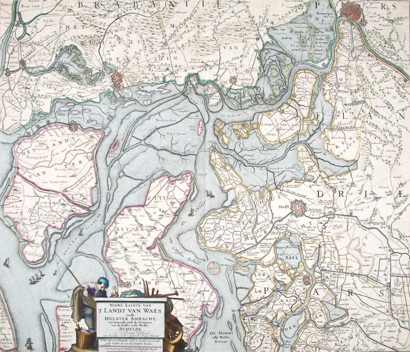 Niewe Kaerte van T Landt van Waes Ende Hulster Ambacht vertoonende oock de Stroomen van de Ooster ende Wester. Schelde: per Nicolaum Visscher, n.d. (c. 1750). Double-page engraved map of the Netherlands. Hand-colored. Some age-darkening; creased down the center; otherwise fine.