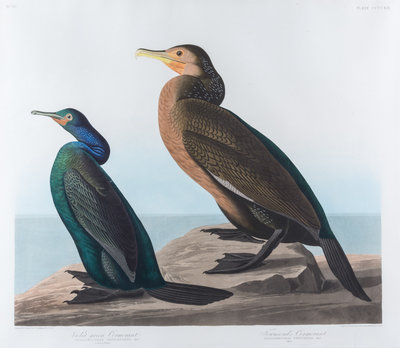 Violet-green Cormorant, Phalacrocorax Resplendens; Townsend's Cormorant, Phalacrocorax Townsendi, plate CCCCXII, no. 83. Engraving with etching, aquatint and hand-coloring, from The Birds of America, c. 1827. Framed and matted.