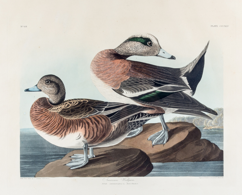 American Widgeon, Anas Americana, plate CCXLV, no 69. Engraving with etching, aquatint and hand-coloring, from the Birds of America, 1827.