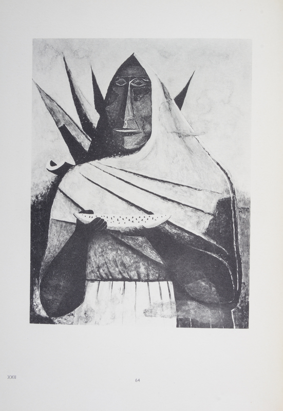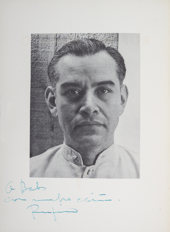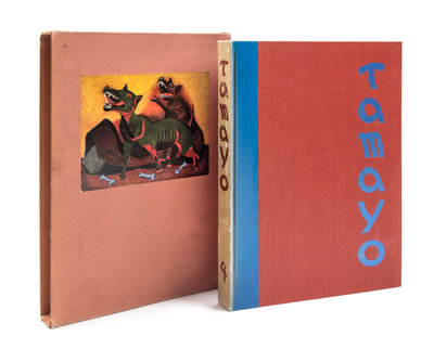 Rufino Tamayo. New York: The Quadrangle Press, 1947.4to, publisher's quarter blue calf over red cloth, board slipcase with pastedown illustration. Complete with original aquatint by Tamayo tipped-in at the front. Limited to 75 copies, of which this is number 74 on Sevir paper signed by the author and artist, additionally inscribed by the artist on the frontispiece portrait. Spine heavily sunned; wear to slipcase.