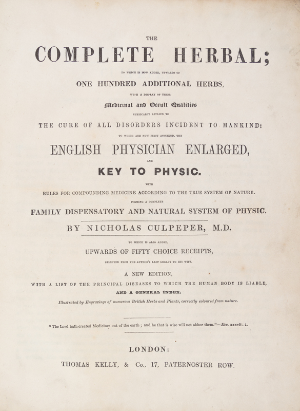 The Complete Herbal... London: Thomas Kelly, n.d. [c. 1850]4to, full tree calf, gilt-stamped and -lettered spine. Complete with engraved frontispiece and 20 engraved hand-colored plates. Wear to boards; scattered foxing; some plates beginning to detach from text block.