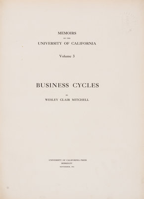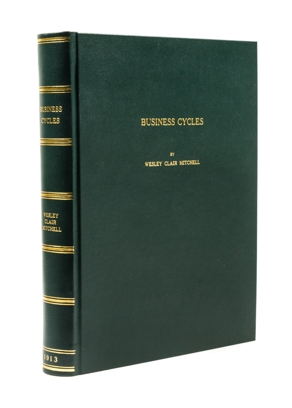 Business Cycles. Berkeley: University of California Press, 1913.4to, rebound in gilt-lettered green leather, slipcase. With numerous charts and graphs throughout. Light soiling and finger smudges to some leaves; ex-library copy with "Beloit College Library" blind-stamp to upper right corner of title page