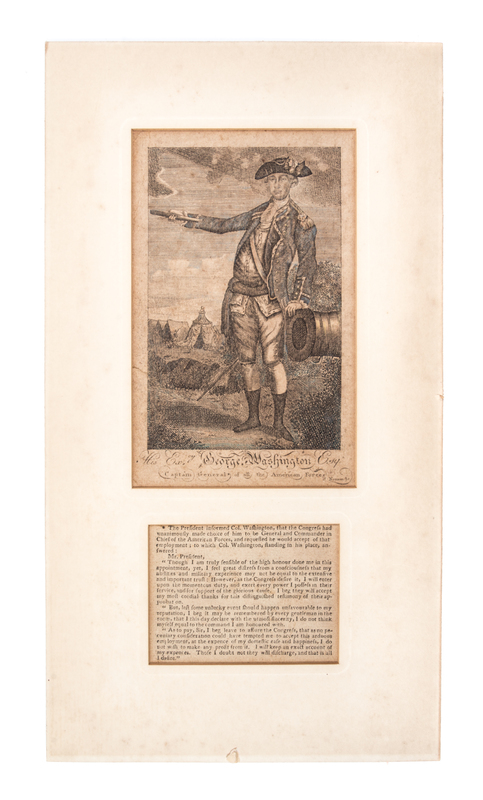 Early engraved portrait clipped from a newspaper, stating that the President has made Colonel Washington General and Commander in Chief of the American Forces.