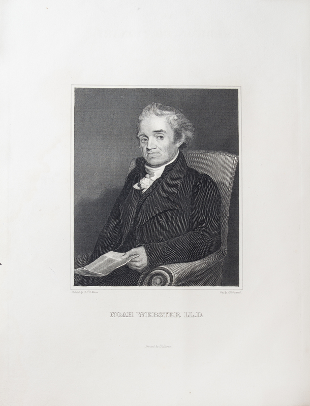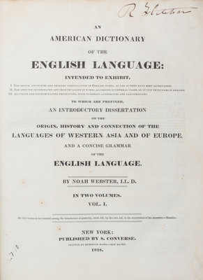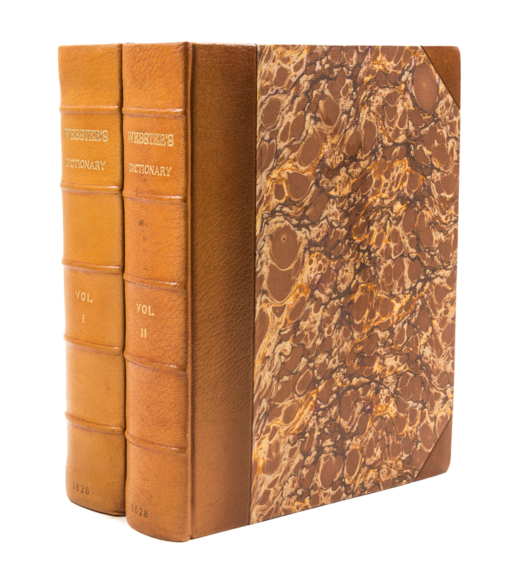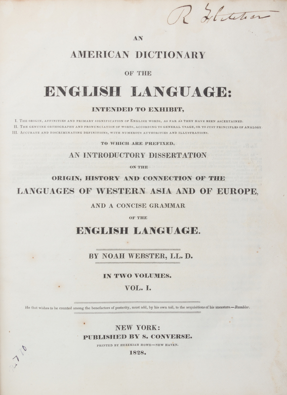 An American Dictionary of the English Language. New York: S. Converse, 1828.2 vols. 4to, modern 3/4 calf over marbled boards, marbled edges and endpapers. First edition, complete, with engraved portrait frontispiece to vol. 1. Previous owner's name written on title pages: R. Fletcher. Richard Fletcher (1788-1869) was U.S. Representative from Massachusetts 1st District (1837-39) and justice of the Massachusetts state supreme court, (1848-53). Dampstain scattered throughout vo. 1.
