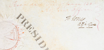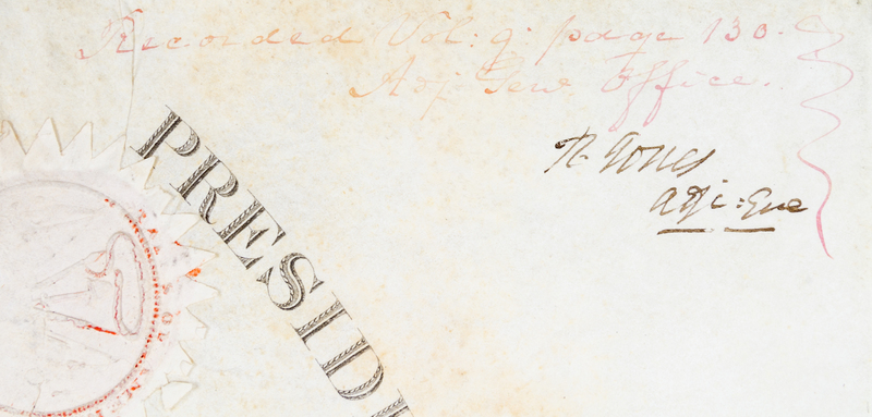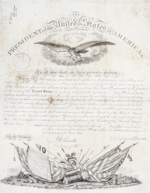 Partially printed document signed ("M. Van Buren"), one page, on engraved vellum, with embossed seal affixed upper left. Washington, January 1, 1838. Appointment of John H. King as Brigadier general of Volunteers. Countersigned by Joel R. Poinsett as Secretary of War .