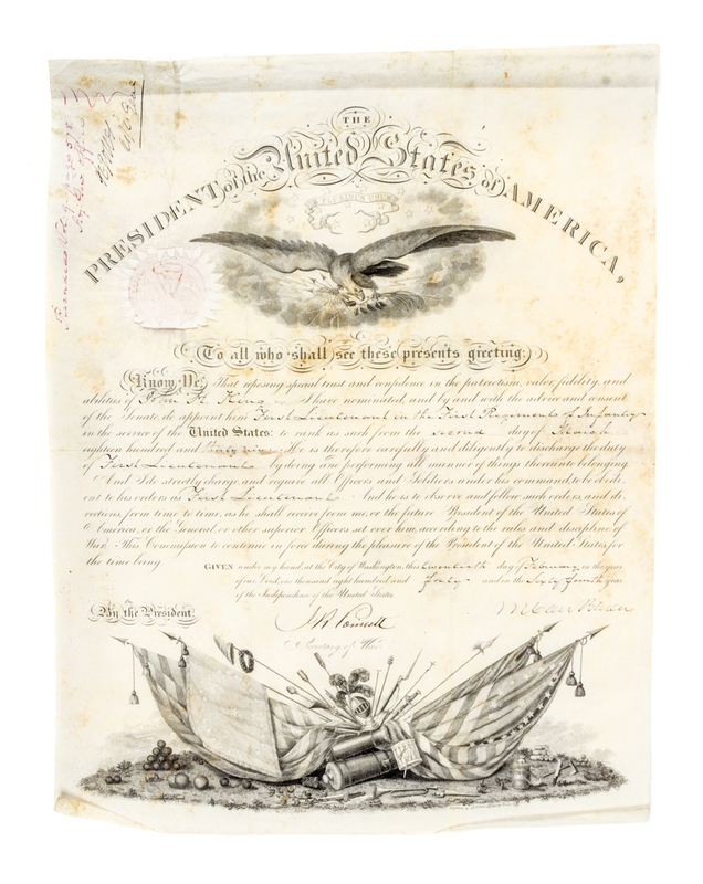 Partially printed document signed ("M. Van Buren") one page, on engraved vellum, with embossed seal affixed upper left. Washington, February 20, 1840. Appointment of John H. King as First Lieutenant in the first Regiment Infantry. Countersigned by Joel R. Poinsett as Secretary of War.