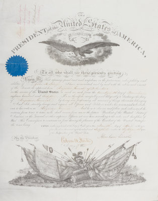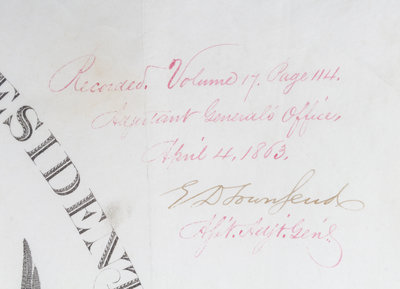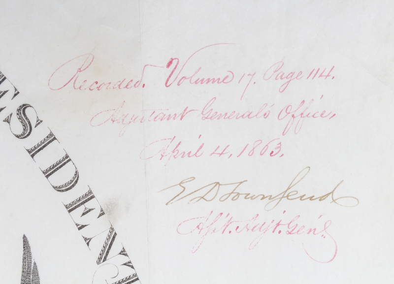 Partially printed document signed ("Abraham Lincoln"), one page, on engraved vellum, with embossed seal affixed upper left. Washington, April 4, 1863. Appointment of John H. King as Brigadier general of Volunteers. Countersigned by Edwin M. Stanton as Secretary of War .