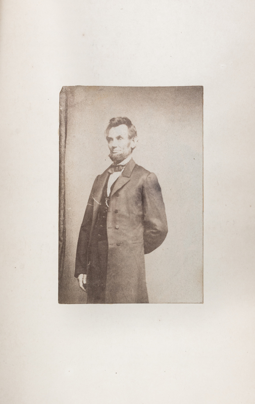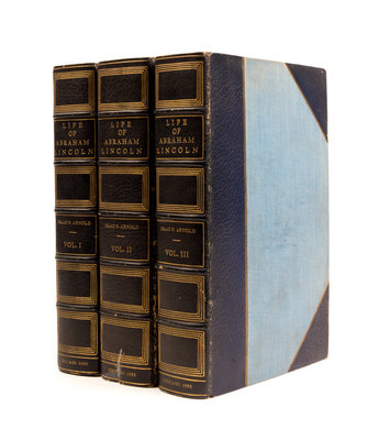 The Life of Abraham Lincoln. Chicago: Jansen, McClurg, 18853 vols. 8vo, 3/4 blue morocco by C. Walters. First edition. Extra-illustrated, to which has been added a unique combination of over 100 autographed items, 125 engravings and illustrations, nine photographs, and other material. Includes: a document autographed by Abraham Lincoln, Mary Todd Lincoln, Robert T. Lincoln, John Quincy Adams, Ulysses S. Grant, James A. Garfield, Millard Fillmore, David R. Atchison, Hannibal Hamlin, William H. Seward, Salmon P. Chase, Cassius M. Clay, Stephen A. Douglas, William Pinkney, Lewis Cass, Horace Greeley, Alexander Stephens, Winfield Scott, Stephen Logan, Gideon Welles, Jefferson Davis, George B. McClellan, Ambrose Burnside, Fitz-John Porter, W. S. Rosecrans, William T. Sherman, David Dixon Porter, Alfred H. Terry, Schulyer Colfax, Oliver Wendell Holmes, et al. There are original photographs of Abraham Lincoln, Mary Todd Lincoln and others. Ephemera includes a political silk ribbon of John Cabell Breckinridge, Vice President (1857-61) and a printed election advertisement for Jefferson Davis and Alexander Stephens. One interesting document attests to an 18th Century account held on behalf of Abraham Lincoln's grandfather.Frank O. Lowden copy, with his bookplate tipped to front pastedowns, designed by Raymond Pearson and signed by the artist. Minor edgewear to boards, with a small tear to the foot of spine on vol. 2. Please inquire for further collation.