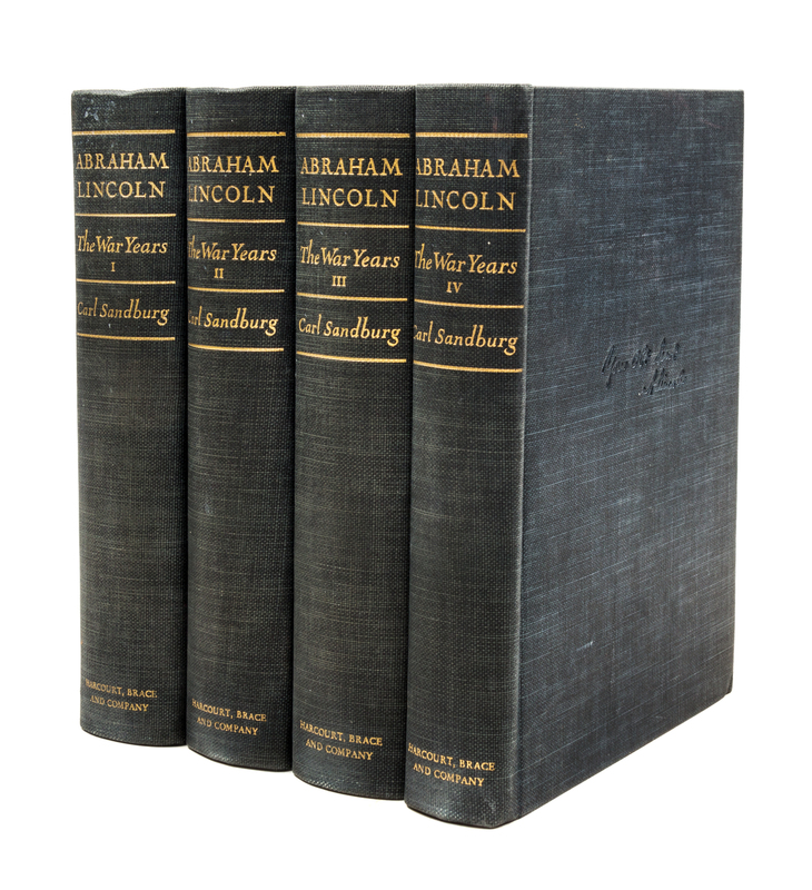 The War Years. New York: Harcourt Brace & Company, 1939.4 vols. 8vo, publisher's blue cloth binding. First edition. Signed by Carl Sandburg on a printed card which is clipped to the front endpaper. Minor fading and shelfwear to boards; small rust mark on f.f.e.o. and signed card from paperclip.